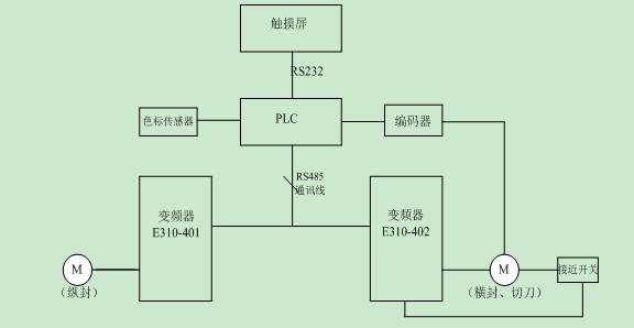 兩臺(tái)E310變頻器由一臺(tái)PLC通訊控制,縱封由一臺(tái)異步電機(jī)單獨(dú)拖動(dòng),橫封和切刀由另一臺(tái)異步電機(jī)拖動(dòng)。正常運(yùn)行時(shí)要求兩臺(tái)電機(jī)保持同步,主運(yùn)行頻率由PLC給定,以保證袋長(zhǎng)的精度。同時(shí),薄膜標(biāo)記傳感器不斷的在檢測(cè)薄膜標(biāo)記(色標(biāo)),機(jī)械部分的編碼器檢測(cè)主軸機(jī)械位置,上述兩種信號(hào)送至PLC,經(jīng)程序運(yùn)算后,如果偏差超過允許值,則由PLC輸出段速信號(hào)給控制橫封和切刀的變頻器,段速的切換由接近開關(guān)控制,主軸每轉(zhuǎn)動(dòng)一圈接近開關(guān)導(dǎo)通一次,導(dǎo)通時(shí)間占1/3,以時(shí)時(shí)調(diào)整橫封和切刀速度,補(bǔ)償偏差,從而把包裝袋長(zhǎng)精確控制在一定范圍內(nèi)。檢測(cè)若在追蹤預(yù)定次數(shù)后仍不能達(dá)到技術(shù)要求,可自動(dòng)停機(jī)待檢,避免廢品的產(chǎn)生。
